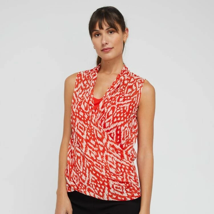 Designed exclusively for Harris Scarfe by Australian Designer Jane Lamerton the Women’s Drape Wrap Blouse Lurex Aztec Print, this top combines a soft drape front wrap and neck gather detail for a flattering and stylish top perfect for day and night. It also includes a cami for extra coverage and is easily paired back with your favourite pants and skirts.