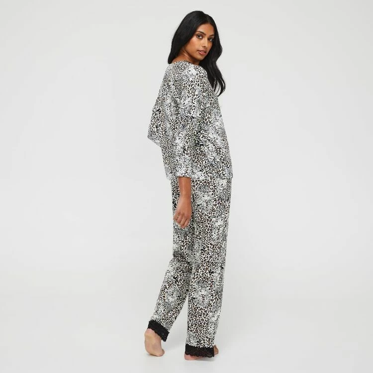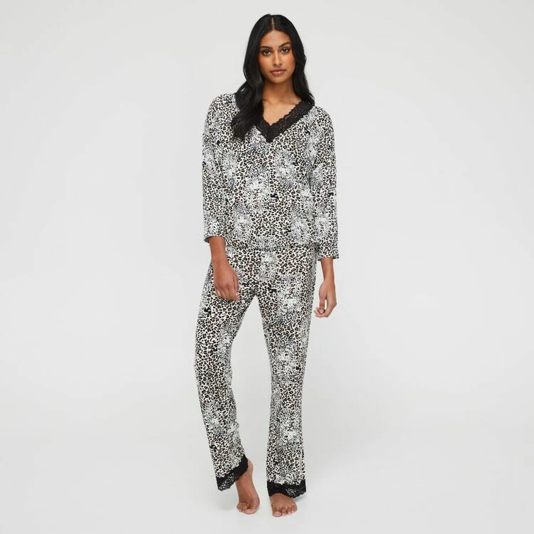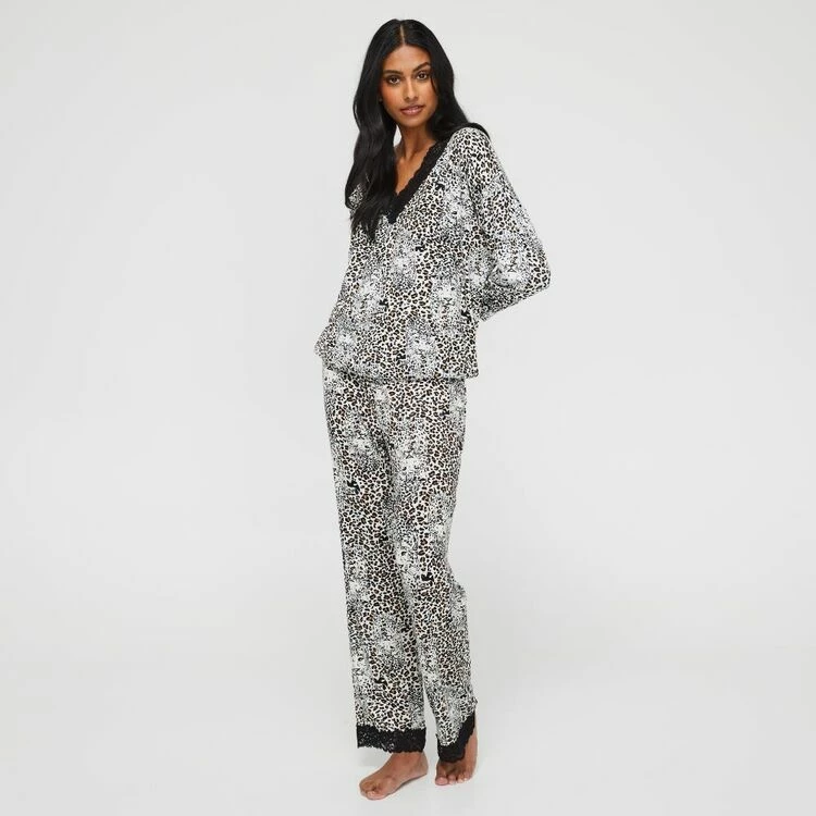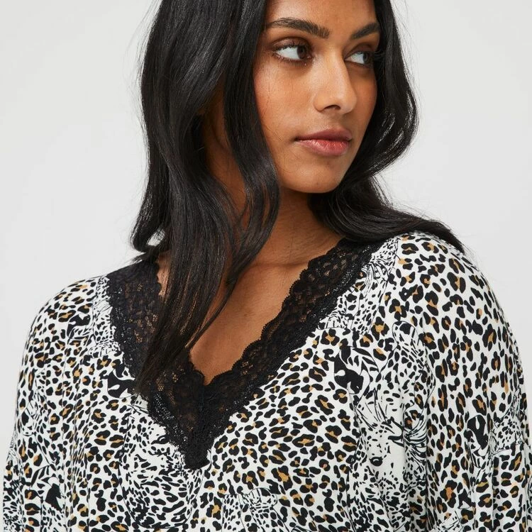 The Jane Lamerton Leopard Long Sleeve Sleep Top is a drop shoulder, jersey sleep top in a fun all over animal print. Composed of soft, breathable viscose, this top features a v shaped neckline with lace detail, loose fit body shape, and hem band with a 3/4 sleeve length. Coordinate with the matching Jane Lamerton Leopard Sleep Pant for a stylishly matching sleepwear ensemble!