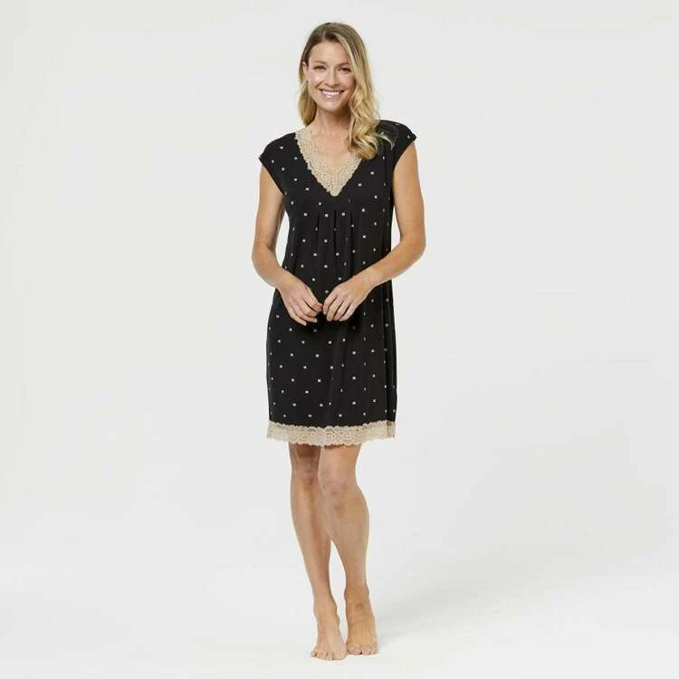 spot print nightie that looks as good as it feels. The neckline is