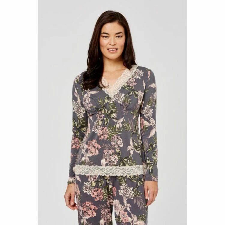 Designed exclusively for Harris Scarfe, this Jane Lamerton Winter Floral Lace Jersey Top is a classic sleepwear top that works perfectly paired back with the matching Winter Floral Lace Jersey Pant. This cosy top has long sleeves and soft lace detail on the neckline and hem, making it the perfect wardrobe essential during those cooler winter nights.