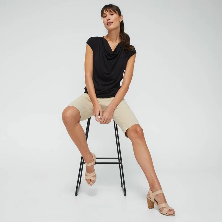 Designed exclusively for Harris Scarfe by Australian Designer Jane Lamerton, this Cowl Neck Basque Top will allow you to enjoy comfort and style made in a soft stretch jersey. Flattering features of this top include a cowl neckline with a basque waistband and extended cap sleeve. This top is available in both black and watermelon.