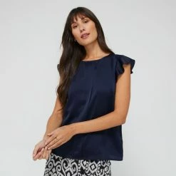 Designed exclusively for Harris Scarfe by Australian Designer Jane Lamerton, the Navy Pleat Front Top is a wardrobe essential top for day and night. This top features a flattering pleat front detail with short ruffle sleeves in a lovely textured satin finish fabric for both style and comfort Pair this top with a skirt and some low-heeled sandals perfect to keep cool while looking stylish!