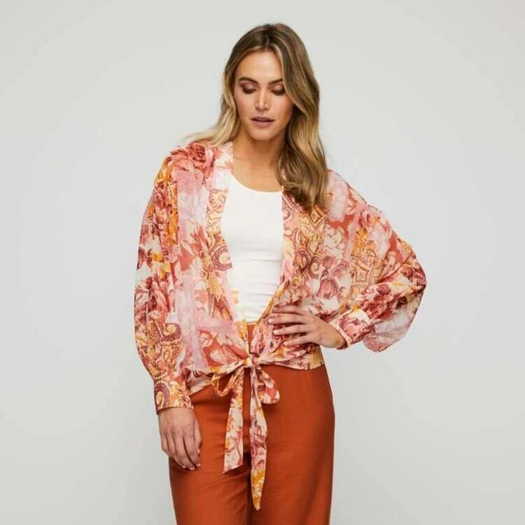 Designed exclusively for Harris Scarfe by Jayson Brunsdon, the Tie Front Kimono Top in spicy sunset tones is the perfect layering piece to add to your summer wardrobe. This kimono top features a full length sleeve with cuffs and a sense of fluid volume that flies away from the body that ties up at the front.