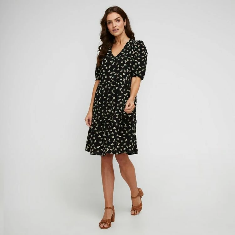 The Khoko Smart Tiered Tunic Dress Dainty Print Black is an easy-to-wear, pull-on dress made in a textured bubble crepe fabric with a lovely print design. This style features a flattering v-neck and a full long sleeve finished with elastic so you can style it your own way. The skirt is full of volume thanks to the tiered detail seams and finishes at the knee. Pair this dress with some cute strappy low-heel sandal shoes for a pretty and graceful look!