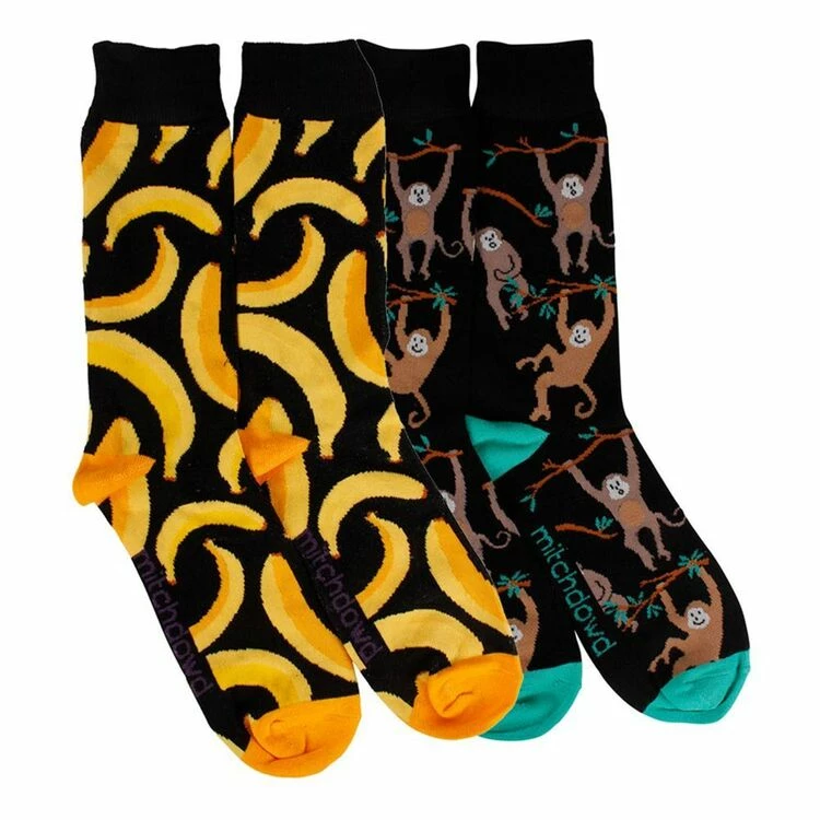 Take a walk in the jungle with this Mitch Dowd Jungle Socks 2 Pack, a snug and comfy double pack featuring a unique monkey and banana printed design on each pair. Made with a contrast colour toe and heel, as well as a double ribbed cuff designed to sit comfortably and securely on your ankle, these socks are perfect for adding a little touch of fun to every-day wear or gifting. With designs this fun, you may just be forgiven for wearing odd socks.