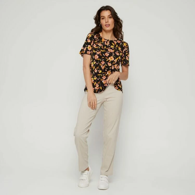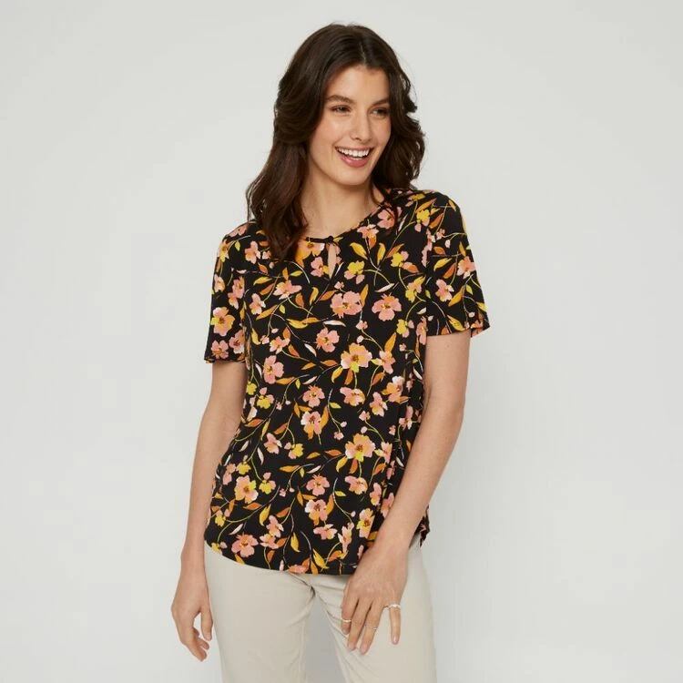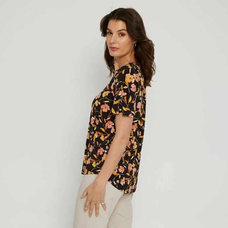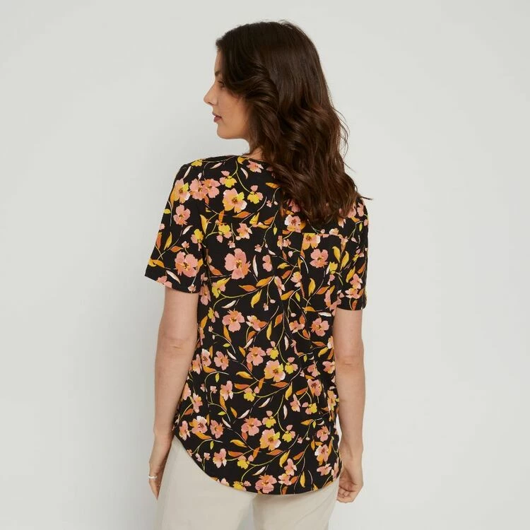 A great wardrobe staple, this easy to wear Savannah High Low Hem Jersey Tee is made in soft, comfortable, stretch jersey. Flattering fit featuring a round neckline with a front split and button detail and high low hem detail with short sleeves. Available in Whisper Floral print. Shop the Savannah range at Harris Scarfe today!